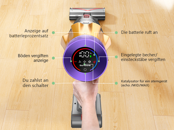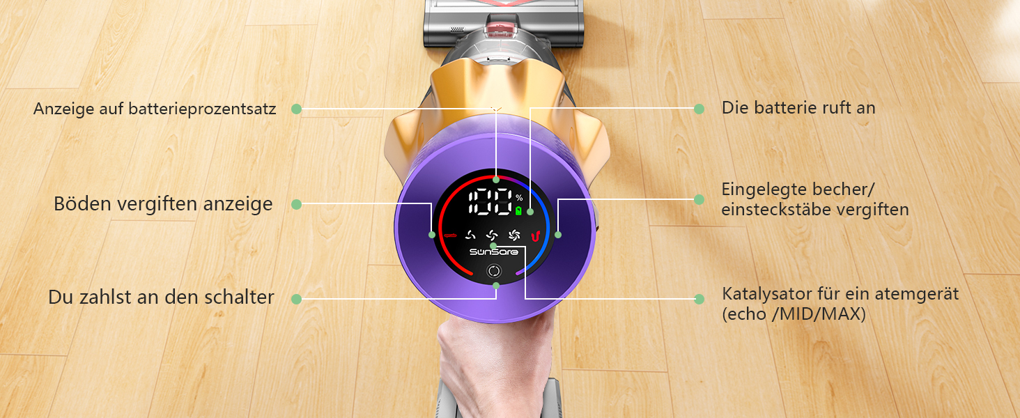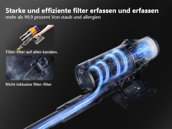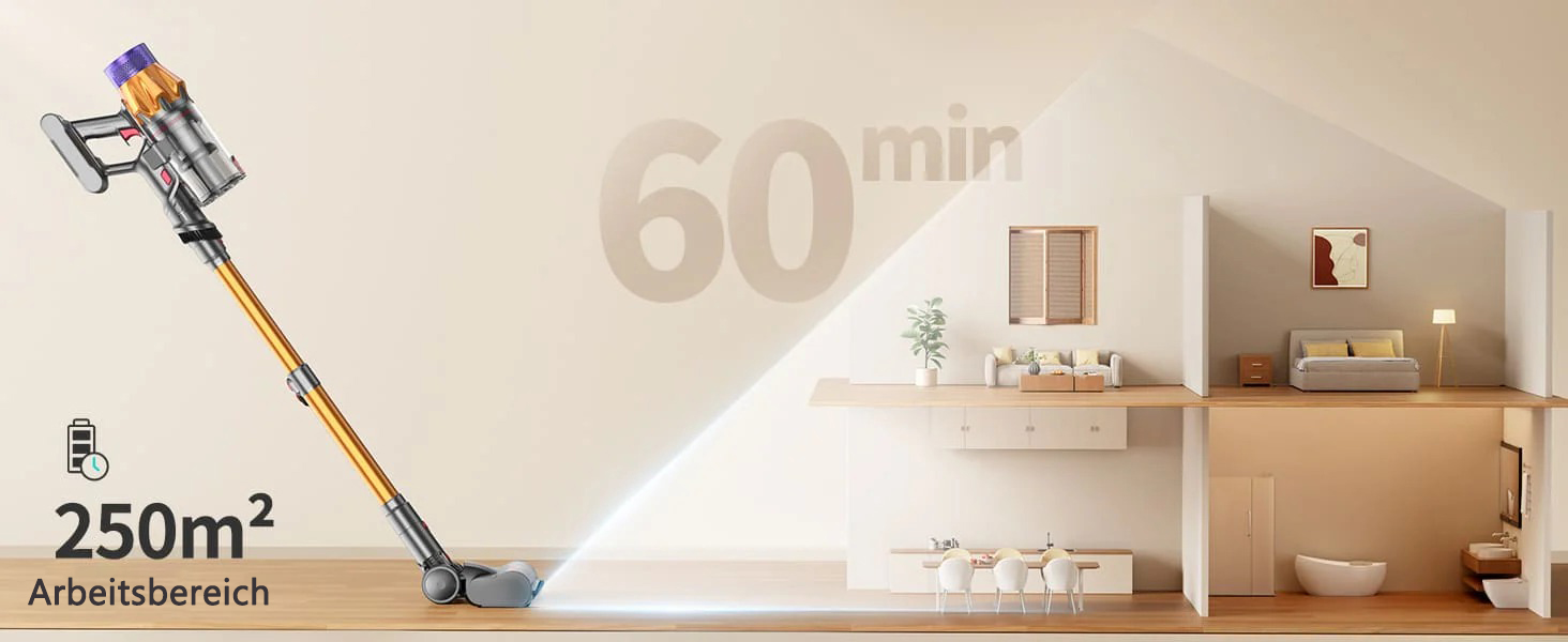 Der Staubsauger  verfügt über eine lange Akkulaufzeit, die unterbrechungsfreie Reinigungssitzungen ermöglicht. Je nach Leistungsstufe können Sie bei voller Ladung mehrere Stunden reinigen, im Powermodus bis zu 30 Minuten.
