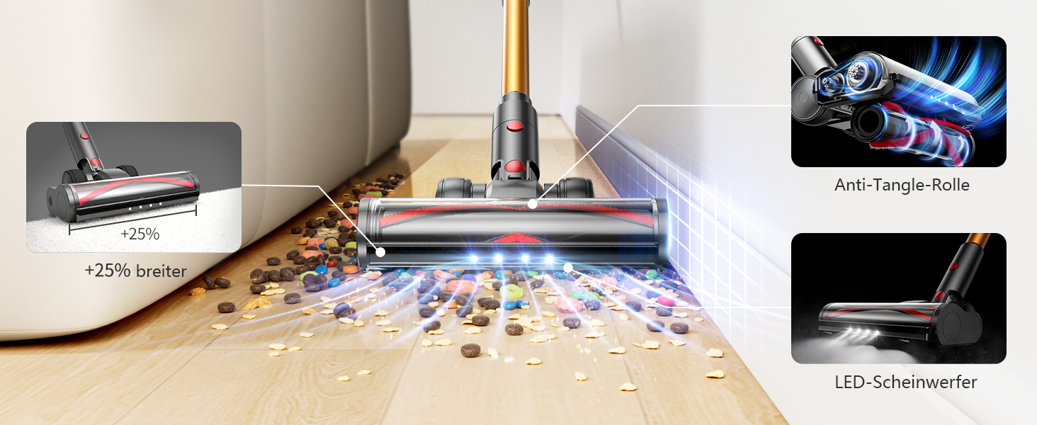 Die 25 % breitere Bürstenrolle verhindert Haarverwicklungen, während LED-Lichter Staub unter Möbeln sichtbar machen – so halbiert sich die Reinigungszeit.